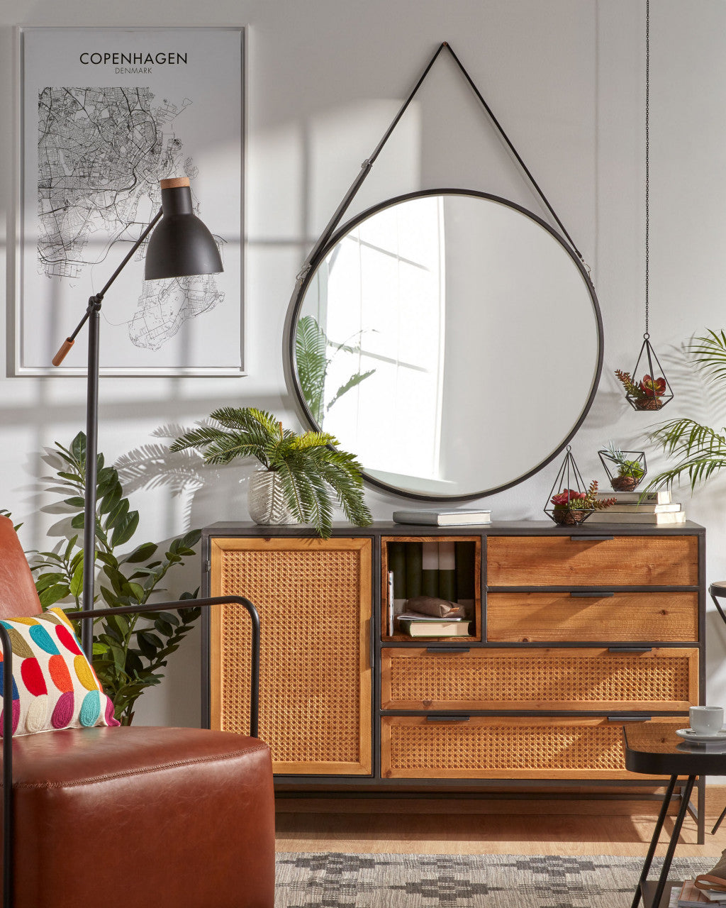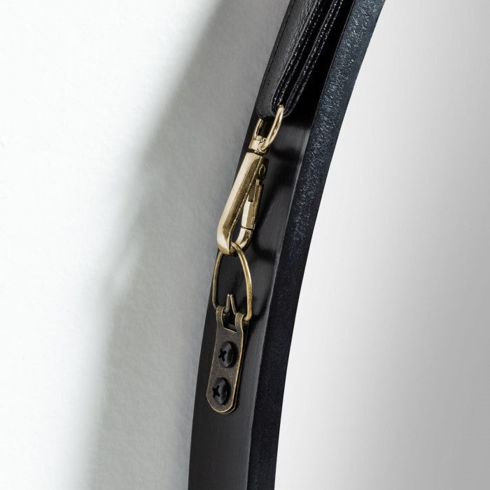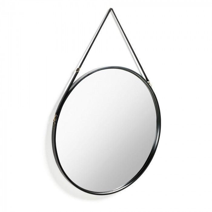 Oglinda mare Raintree Ø80 cm cu rama neagra are un design original care permite sa fie atarnata pe perete datorita unui maner din piele. De asemenea, are o catarama pentru a-i regla inaltimea. Dar daca preferati sa o asezati pe o piesa de mobilier sau pe un raft, puteti sa scoateti curea cu usurinta si sa o depozitati, deoarece are doua carlige care va vor permite sa o puneti la loc.