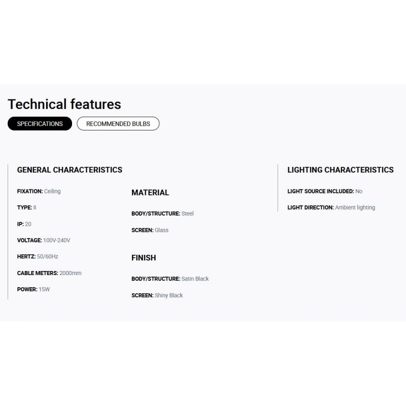 Materiale | structura metal negru satin, abajur sticla negru lucios |