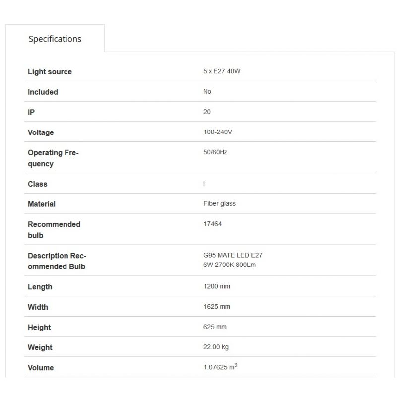 Putere | 5x40Watt E27 excl. 220-240V,50-60Hz |