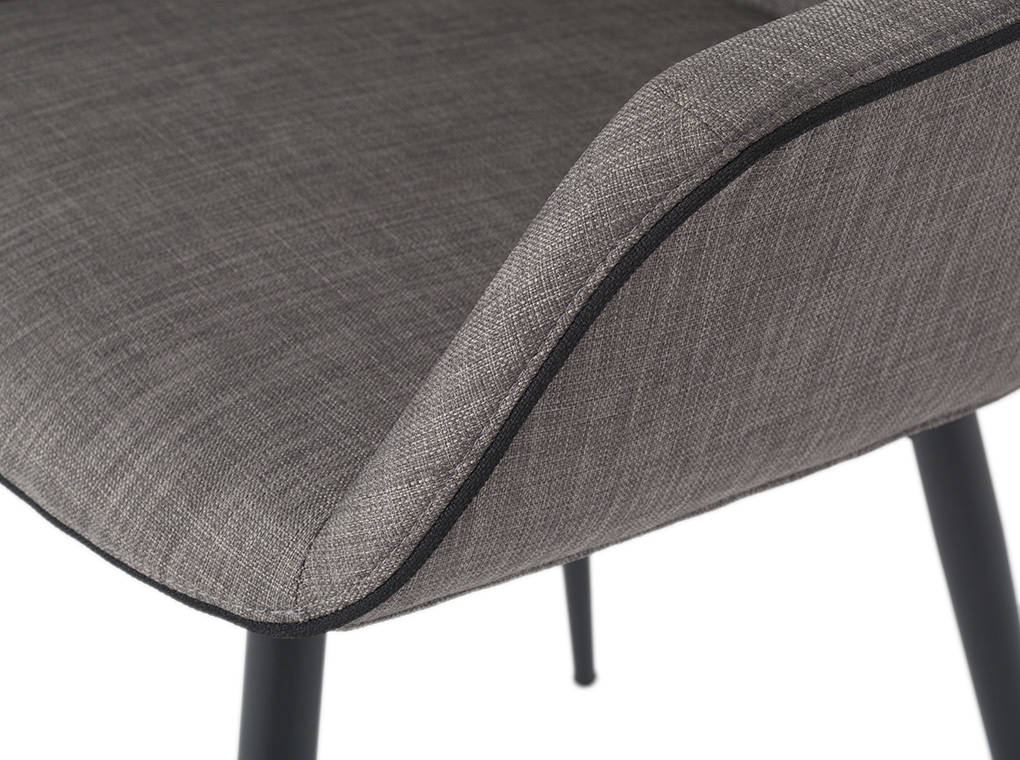 Acest scaun de dining modern cu brate si tapitat intr-un material gri, cu tiv negru, este o piesa de mobilier avant-gardista si contemporana, cu picioare din otel negru, care va deveni indispensabila in camera de mese. Este un scaun de calitate, durabil si functional, care ofera un confort maxim datorita densitatii de 25 kg / m3 a spumei poliuretanice si designului infasurator al spatarului. Acest scaun poate fi integrat in orice tip de living, sala de mese sau bucatarie, devenind protagonistul camerei si oferind un aspect sofisticat si elegant.