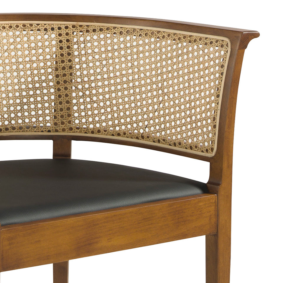 Acest scaun de dining cu spatar din rachita si structura din lemn de nuc este perfect pentru a adauga o nota de eleganta si tendinta in casa ta. Fabricat din lemn de frasin solid si tapitat in eco-piele neagra, scaunul este confortabil si durabil. Spatarul sau original din plasa de rachita ii confera un stil modern si unic, iar dimensiunea sa si umplutura din spuma poliuretanica de 30kg/m3 iti ofera confort maxim. Versatil si functional, acest scaun se potriveste in orice tip de living sau sufragerie, devenind protagonistul camerei tale.