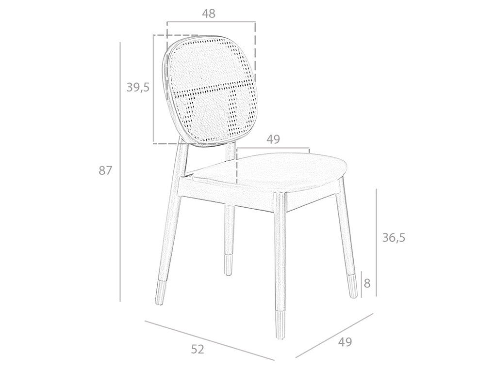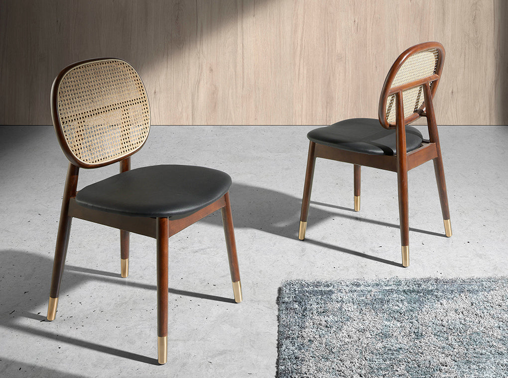 Acest scaun de masa din lemn de frasin solid vopsit in culoarea nucului si detalii din otel de culoare aurie, cu un scaun confortabil tapitat in piele artificiala neagra si umplutura din poliuretan de 25 kg / m3, este un obiect de design modern si elegant. Spatarul sau original din plasa de rachita ii ofera un touch de tendinta si personalitate unica. Este un scaun versatil si functional, potrivit pentru orice tip de sufragerie sau sala de mese. Calitatea sa este garantata de cele mai bune materiale de calitate, iar confortul este asigurat de umplutura sa din spuma de poliuretan. Dimensiunea sa ii permite sa ofere confort maxim, fara a neglija cea mai mare tendinta.