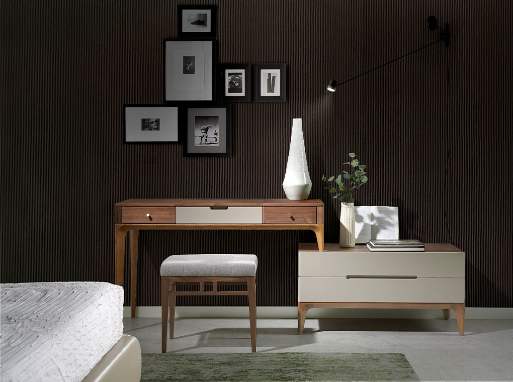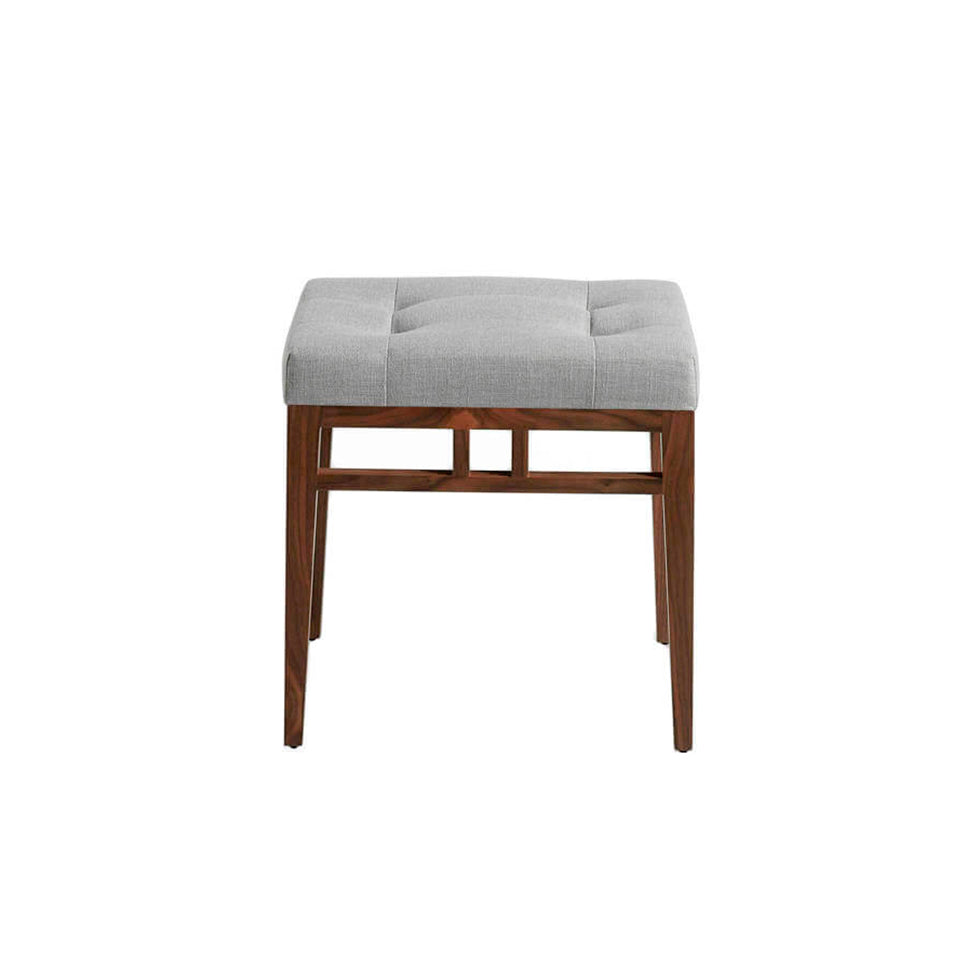 Taburetul tapitat cu material gri este un element de mobilier modern si elegant, perfect pentru a aduce un plus de caldura si sofisticare in dormitorul dumneavoastra. Cu o structura robusta si picioare din lemn furniruit cu nuc, acest taburet poate fi folosit ca un scaun pentru zona de toaleta sau plasat la picioarele patului. Fabricat cu cele mai inalte standarde de calitate, acest taburet este confortabil si functional, fiind potrivit pentru orice tip de dormitor sau dressing.
