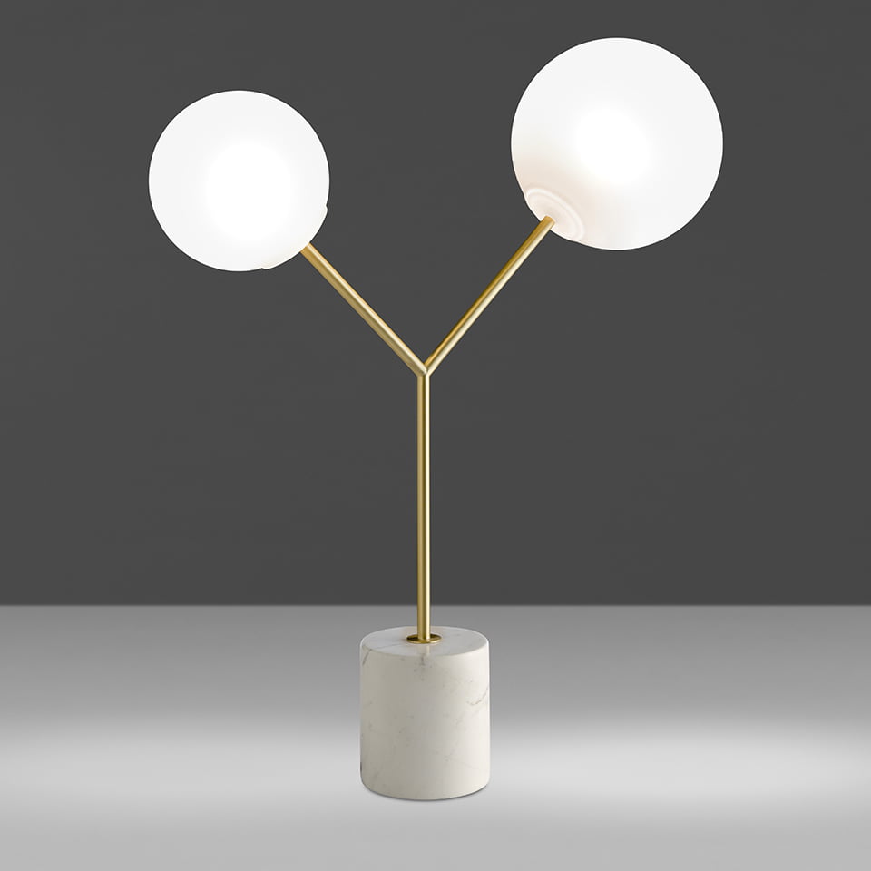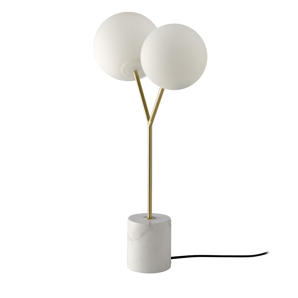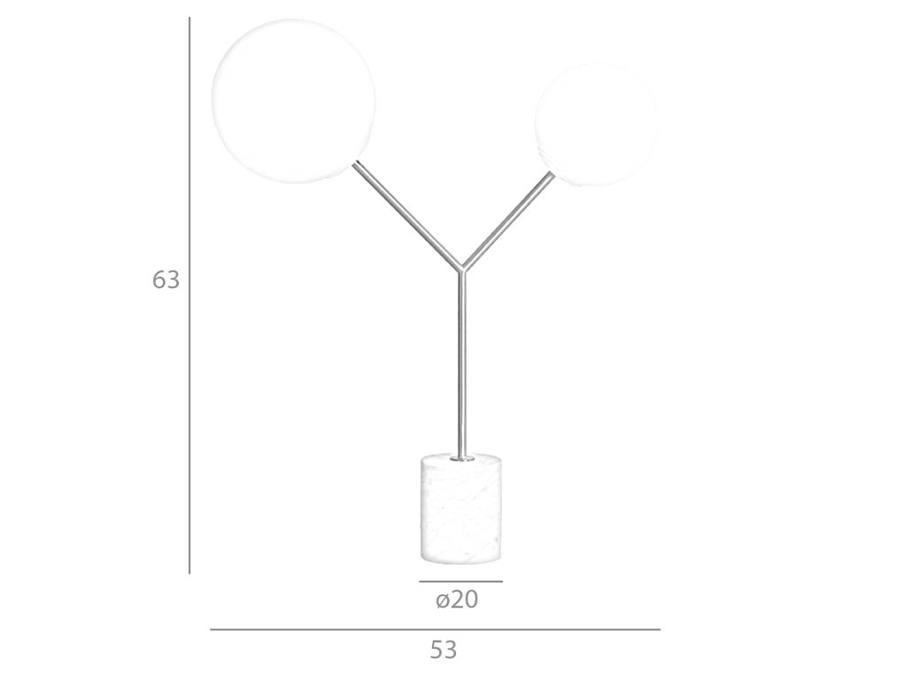 Aceasta veioza din marmura alba, otel auriu si sticla alba este un accesoriu modern si elegant pentru orice camera. Baza sa din marmura portelanata similara cu calacatta si corpul din otel auriu ofera un finisaj de design inoxidabil. Doua becuri din sticla alba completeaza aspectul minimalist si sofisticat al acestei lampi. Este versatila si se potriveste cu orice tendinta in decor. Fabricata din materiale de cea mai inalta calitate, aceasta veioza este durabila si functionala. Caracteristicile tehnice includ doua becuri LED neincluse si inlocuibile E27 de 13W-3000K, tensiune/frecventa 230V si 50 Hz, IP: 20 clasa II, rating energetic A++. Lungimea cablului este de 200 cm. Dimensiunile sale o fac potrivita pentru a fi amplasata in orice camera din casa ta.