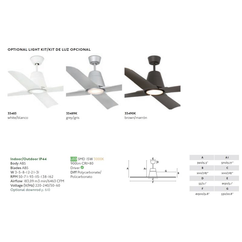 Descriere | motor din otel finisaj alb, lame din ABS nuanta alb, difuzor policarbonat (optional kit iluminat LED ref. 33483 exclus din pret) |