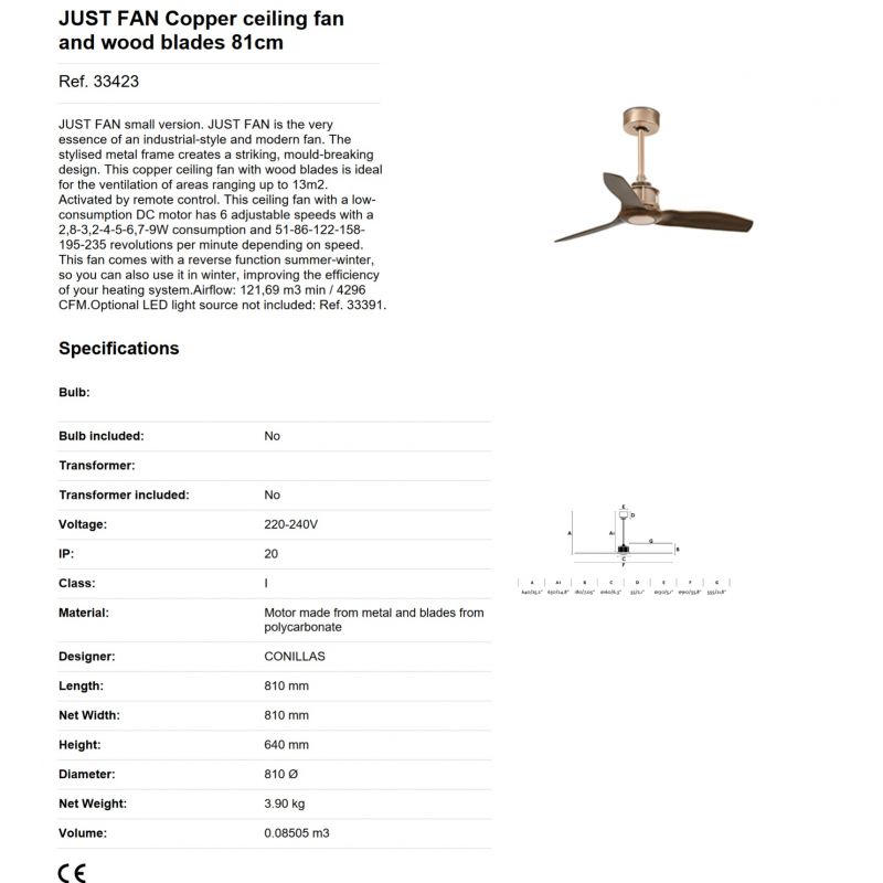 Ventilator de tavan cu telecomanda design modern JUST FAN cupru / lemn nuc