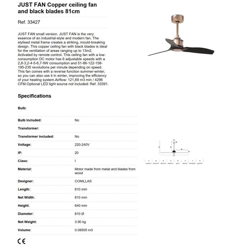 Descriere | motor din metal finisaj cupru, lame din policarbonat nuanta negru mat, (optional kit iluminat LED ref. 33391 exclus din pret) |