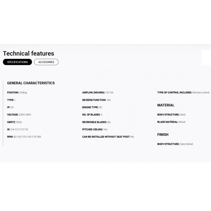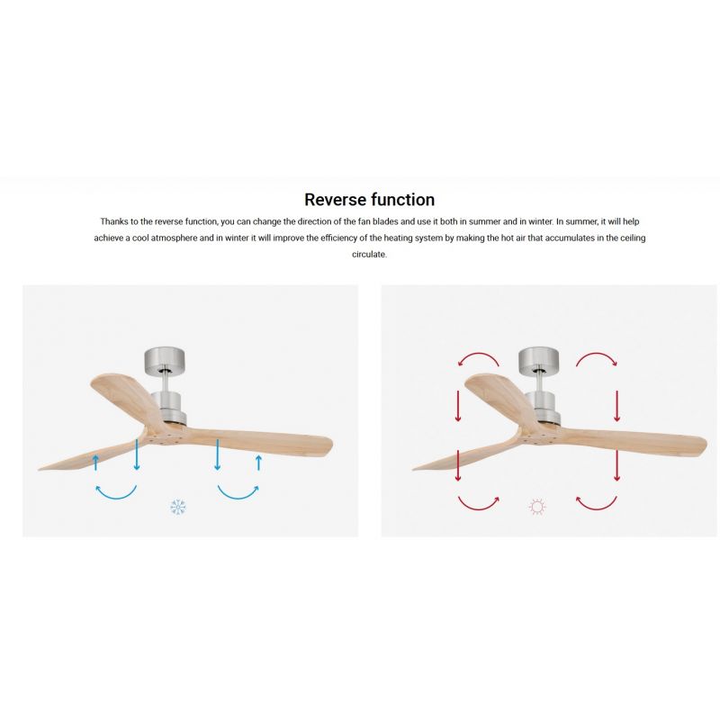 Informatii produs: | ventilator de tavan cu functie reversibila iarna-vara, actionat prin telecomanda (inclusa) cu 6 trepte de viteza reglabile 5-8-12-17-27-35Watt si 82-102-125-145-170-188rpm |