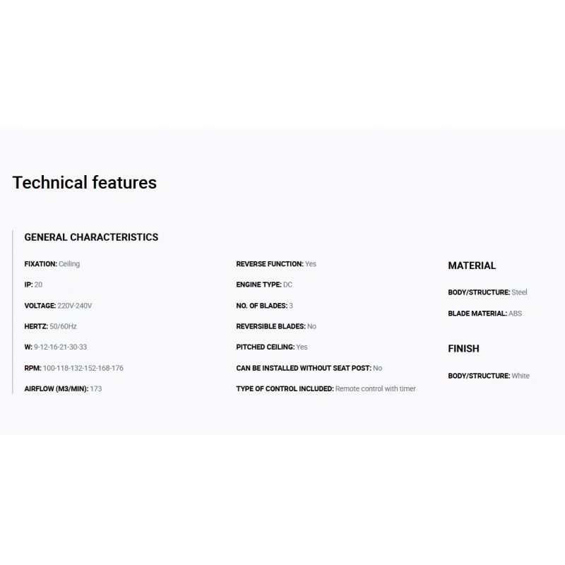 Informatii produs: | Ventilator cu telecomanda, cu functie reversibila iarna-vara, 6 trepte de viteza reglabile 9-12-16-21-30-33Watt si 100-118-132-152-168-176rpm, activat prin telecomand? inclus? |