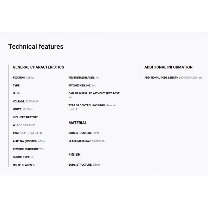 Informatii produs: | ventilator tavan cu telecomanda cu functie reversibila iarna-vara, 6 trepte de viteza reglabile 4-6-10-15-22-35 Watt si 30-41-53-64-74-88rpm. |